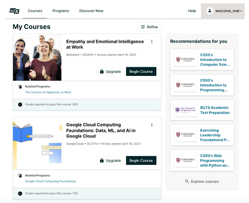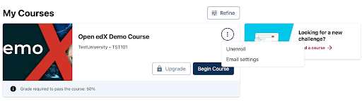 Like the prior course dashboard experience, courses are presented in a series of course cards. Course cards display the course thumbnail, information about the course, upgrade options, and pathways for learners to resume course content. Further course actions, such as unenrolling and other opt-in settings, have been moved to the triple-dot menu at the upper righthand corner of the course cards.