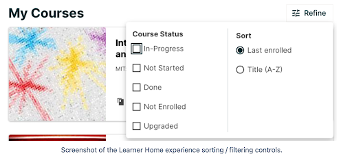 Learners can use the new “refine” button on Learner Home to filter through large lists of courses by course status. They can also sort by the most recent enrollment date or title.